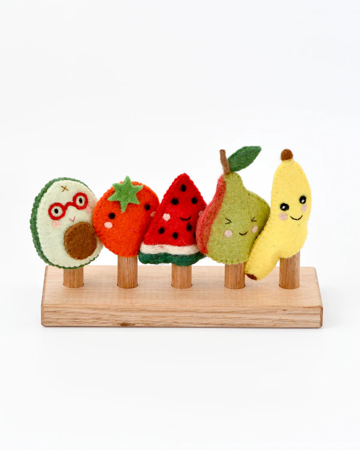 Add a splash of fruity fun to your child’s playtime with our Felt Fruits Finger Puppets Set! This vibrant collection features a delightful array of fruit characters: a pear, a watermelon, a tomato, an avocado with glasses, and a banana.